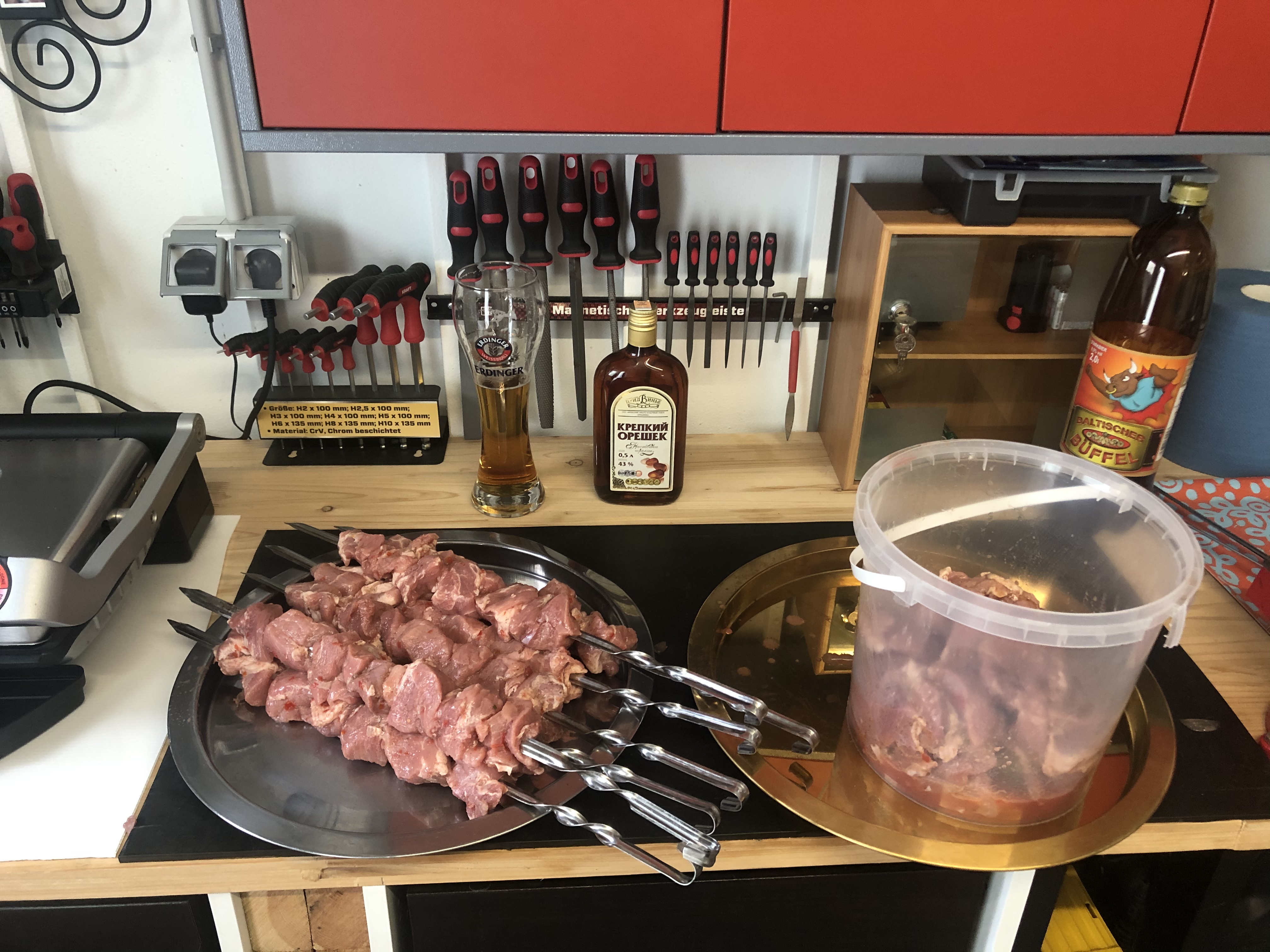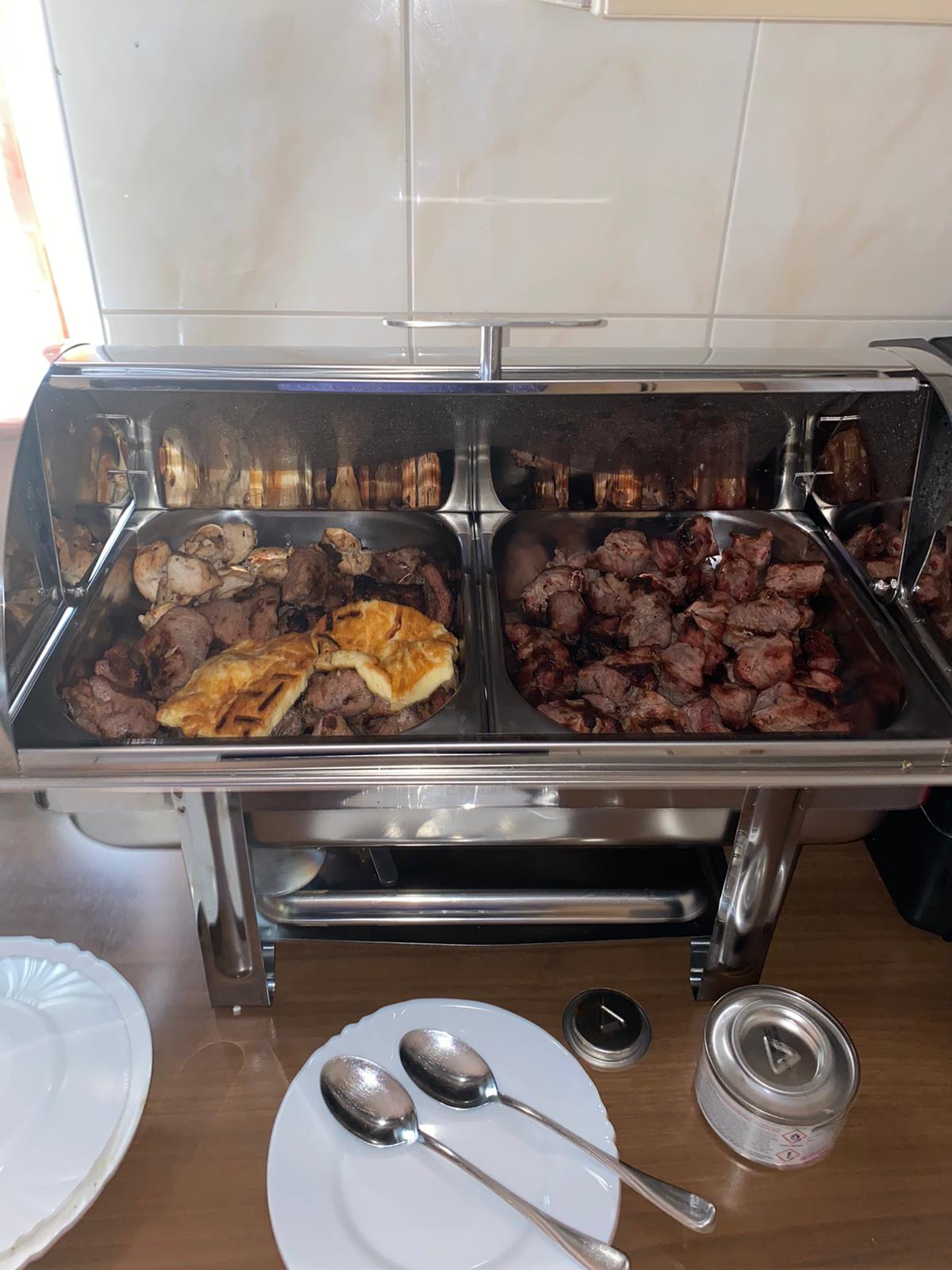 Это контейнер, он двойной. В основной наливается вода потом в него ставятся металлические чаши с едой, это может быть готовый картофель, в данном случае шашлык. Под контейнерставятся специальные горелки, которые греют воду, Пиша остается горячей.